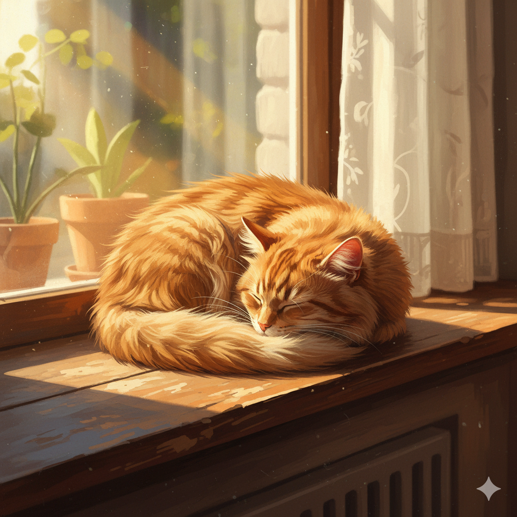 A fluffy, orange cat curled up asleep in a sunbeam on a worn wooden windowsill.
